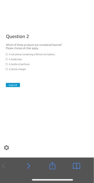 Dangerous goods also called hazmat are substances or materials that may pose a risk during storing handling or transporting because they contain flammable pressurized corrosive or otherwise harmful substances. A cell phone containing a lithium-ion battery A teddy bear A bottle of perfume A phone charger Submit Question 3 Which of these hazmat products are allowed in your FC. O A cell phone containing a lithium-ion battery O A teddy bear O A bottle of perfume OA phone charger Submit.